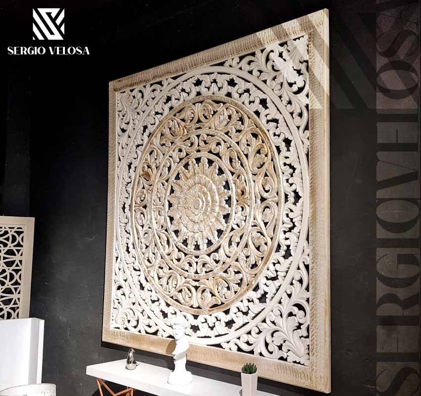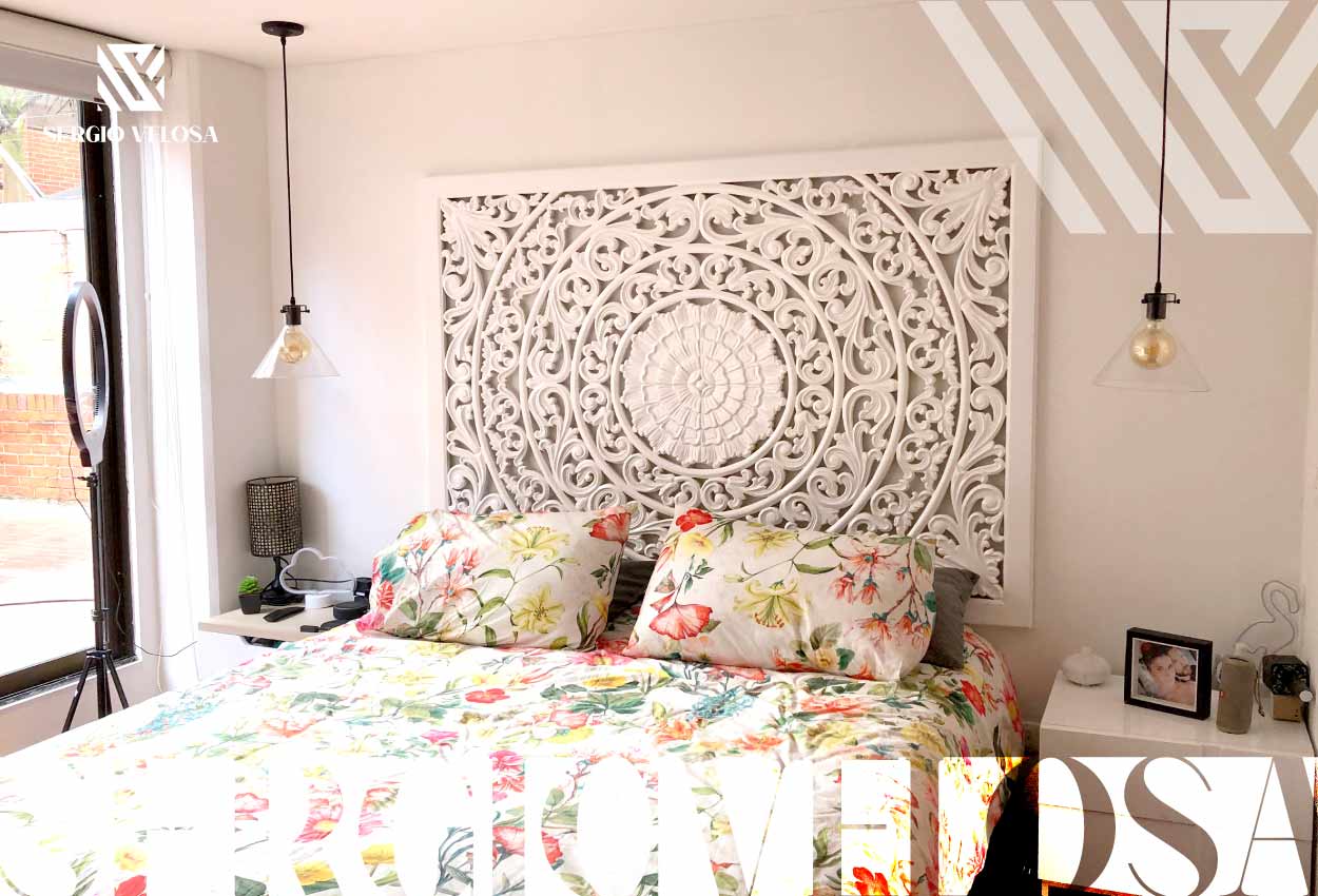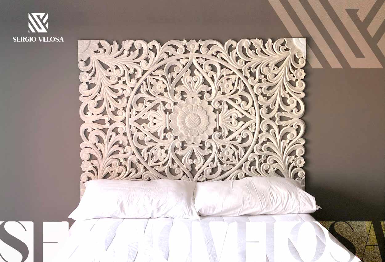 Cabeceros Mandala en las habitaciones son una de las alternativas con mayor auge. Hay diferentes formas de hacerlas sin embargo las más apetecidas son las talladas a mano, sobre madera, por nuestros artesanos, los colores para ambiente de hogar son por lo general en un patrón de tonos suaves, como el blanco el beige con difuminados en pale , plata champaña y dorado